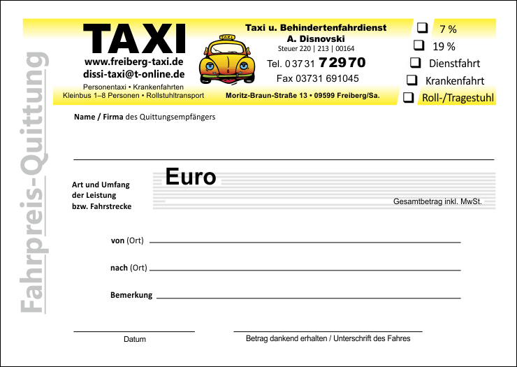 Werbefläche — Quittungsblock | Werben Sie auf unseren Quittungsblöcken für Ihr Unternehmen. Nahezu jeder Fahrgast fragt nach einer Quittung! Das Paket beinhaltet die gesamte Rückseite sämtlicher Quittungen. Auf der Vorderseite können Sie zudem noch Ihr Firmenlogo präsentieren. Sie können gezielt einen bestimmten Zeitraum für Ihre Werbung wählen in welchem dann ausschließlich Quittungen mit Ihrer Werbung ausgegeben werden. Drucken Sie z.B. Coupons auf die Rückseite der Quittung, um zusätzlich vom Rücklauf dieses herausragenden Werbeträgers zu profitieren.